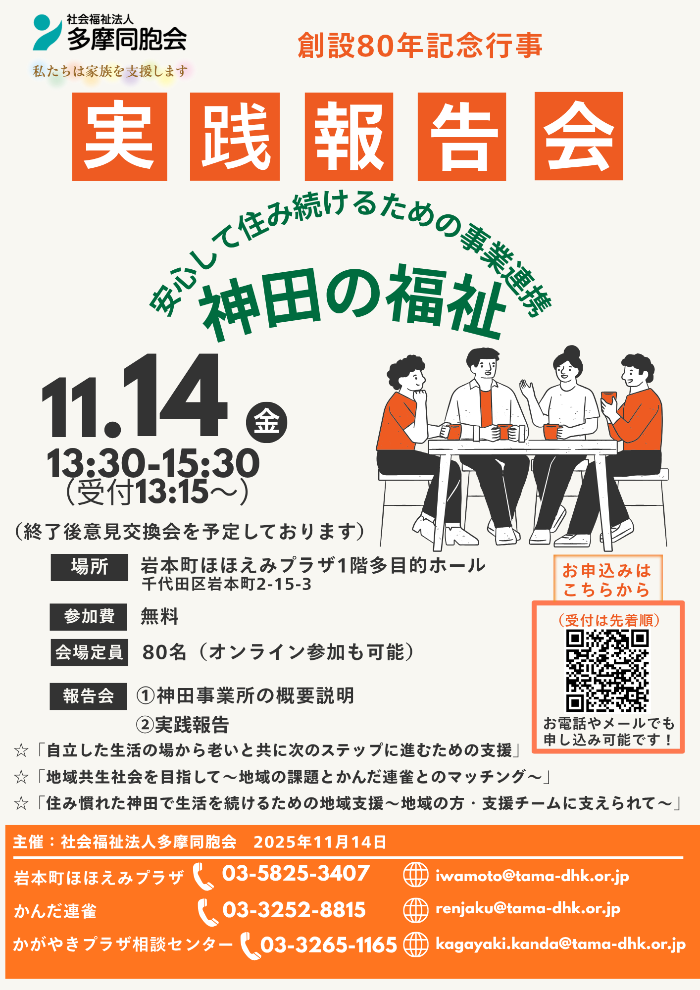法人創設80年を迎え、日ごろの取組をご報告するために、地区ごとに実践報告会を開催いたします。神田地区では大勢のみなさまにご参加いただけるように会場開催とオンラインにて公開することになりました。みなさまのお申込みをお待ちしております。
