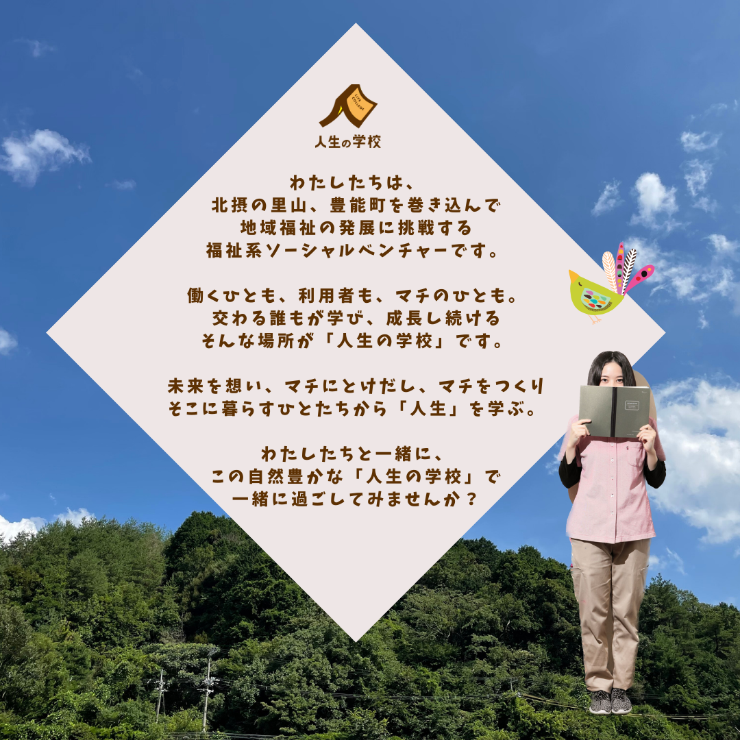 私たちは、大阪の北摂「豊能町」のゆったりとした場所で そこに暮らすひとたちを巻き込みながら 高齢者・障がい者福祉事業、地域福祉の発展に挑戦するローカルソーシャルワークの法人です。 働くひとも、利用者も、マチのひとも、交わる誰もが学び、成長し続ける そんな場所が「豊悠福祉会=人生の学校」です。