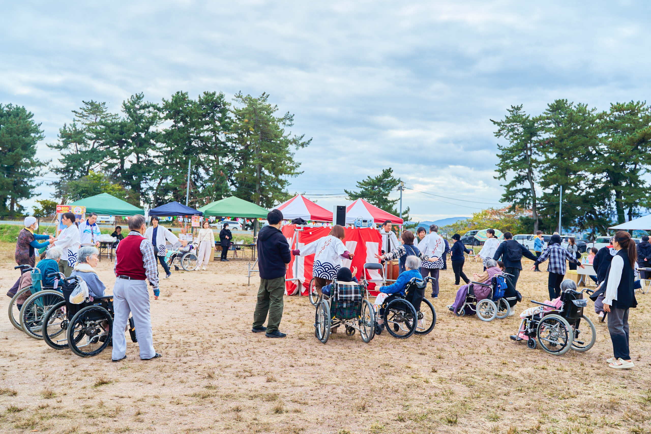 座ったままでも踊れる地域の盆踊りを、みんなで踊る、ひとコマも。