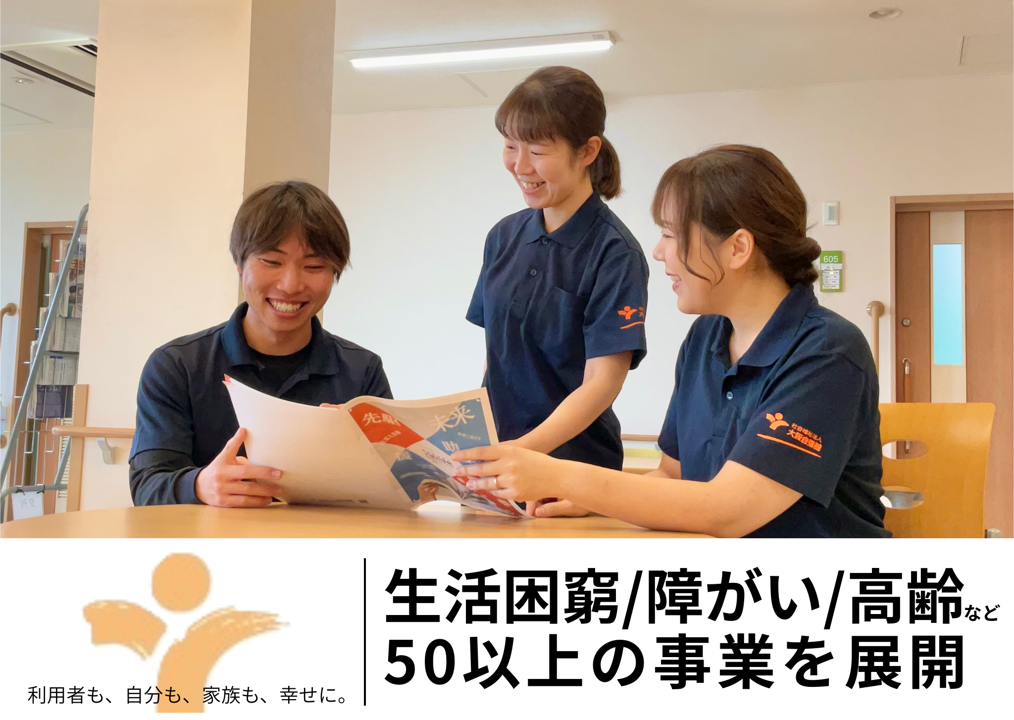 明治45年にあいりん地区に創設されて以来、百年以上にわたり福祉に向き合ってきました。現在は大阪市西成区・東淀川区・滋賀県高島市に範囲を広げ、生活困窮・高齢者支援・障がい者支援・医療事業等に取り組んでいます。