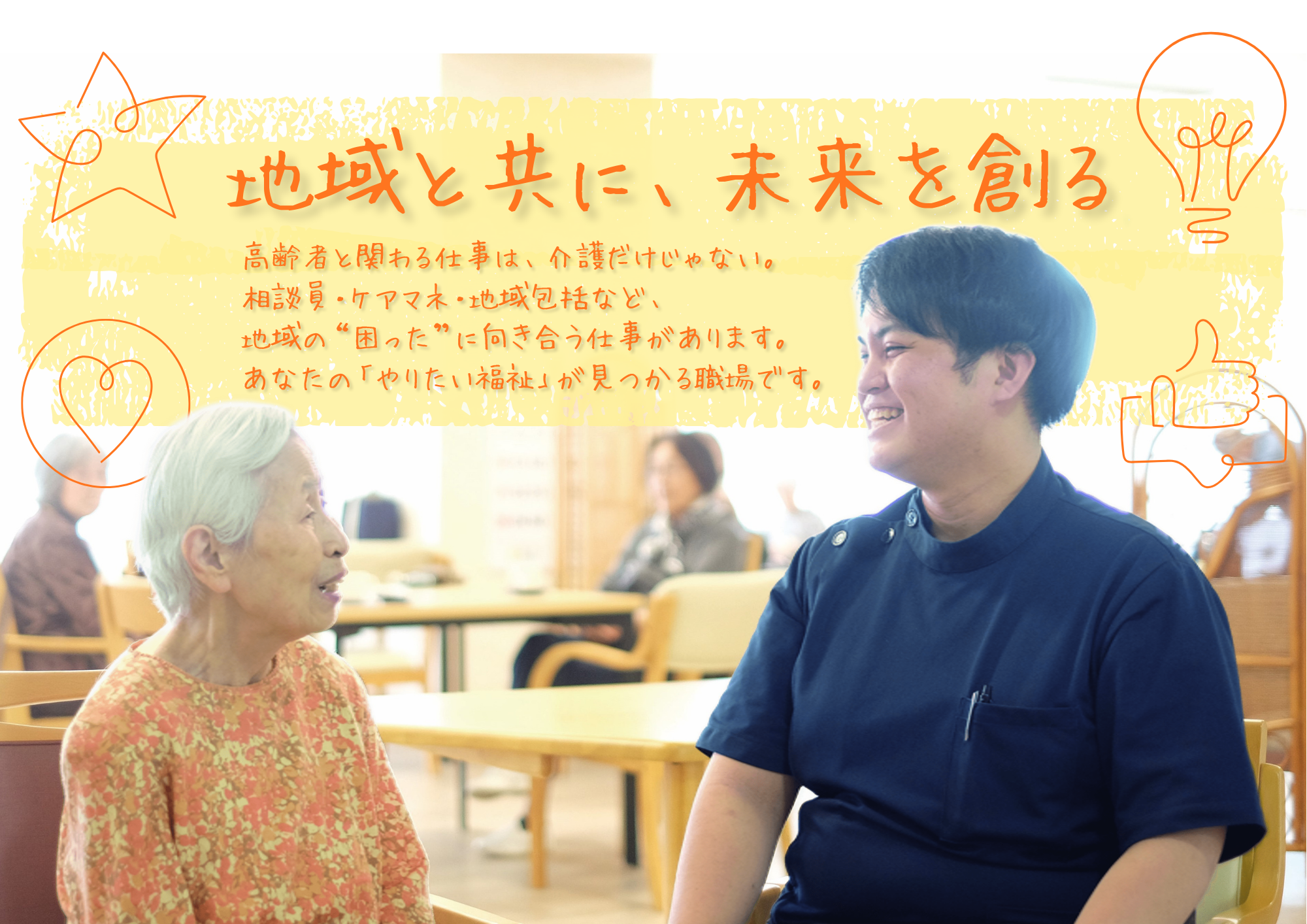 各ライフステージに対応した多様な事業があるため、現場でのケアだけでなく、地域活動や相談業務など、自分の得意分野や興味に応じた活躍が可能です。利用者やご家族との関わりを通じて、生活に寄り添う支援ができることに加え、職員同士も助け合いながら成長できる職場環境です。