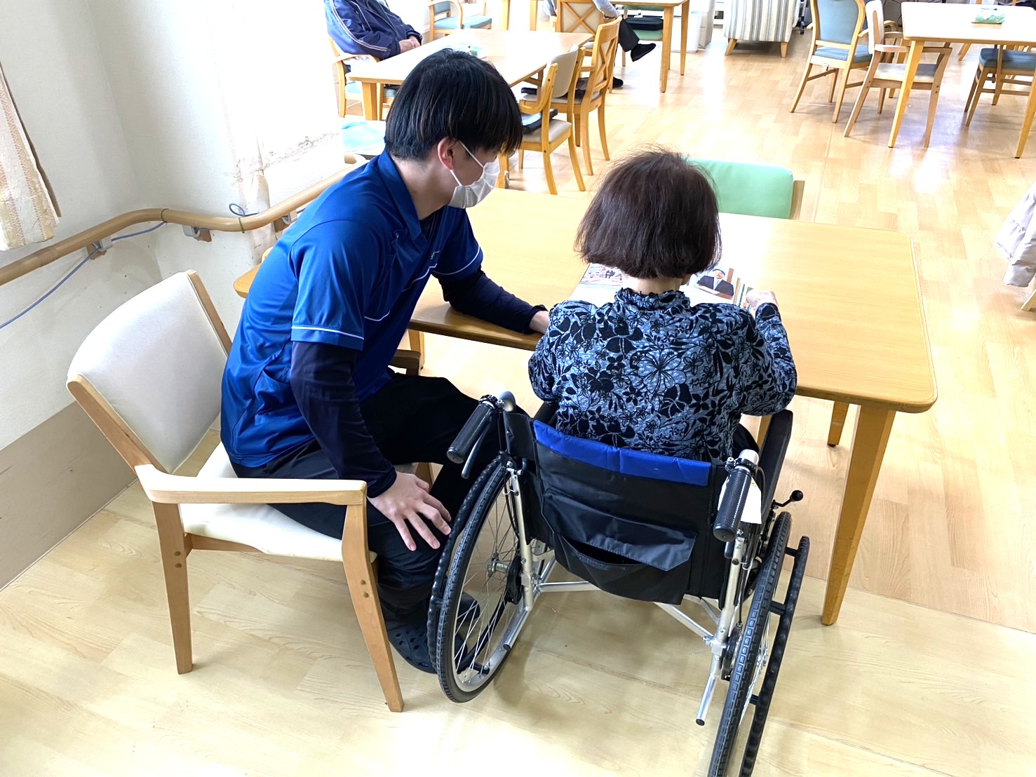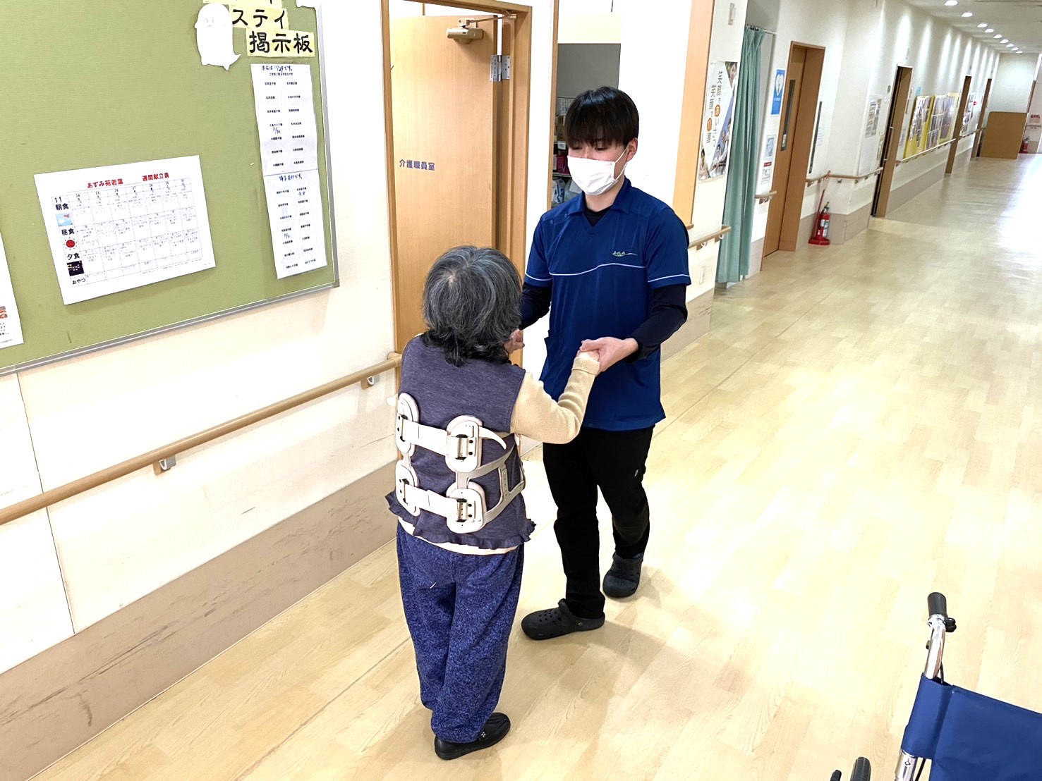 日勤・夜勤を中心に勤務をしていますが、「あずみ苑若葉」では日勤の担当者はその日の業務リーダーとなるため、お客様が快適にお過ごしいただけるよう、必要な介助や職員への指示出しも行うことがあります。