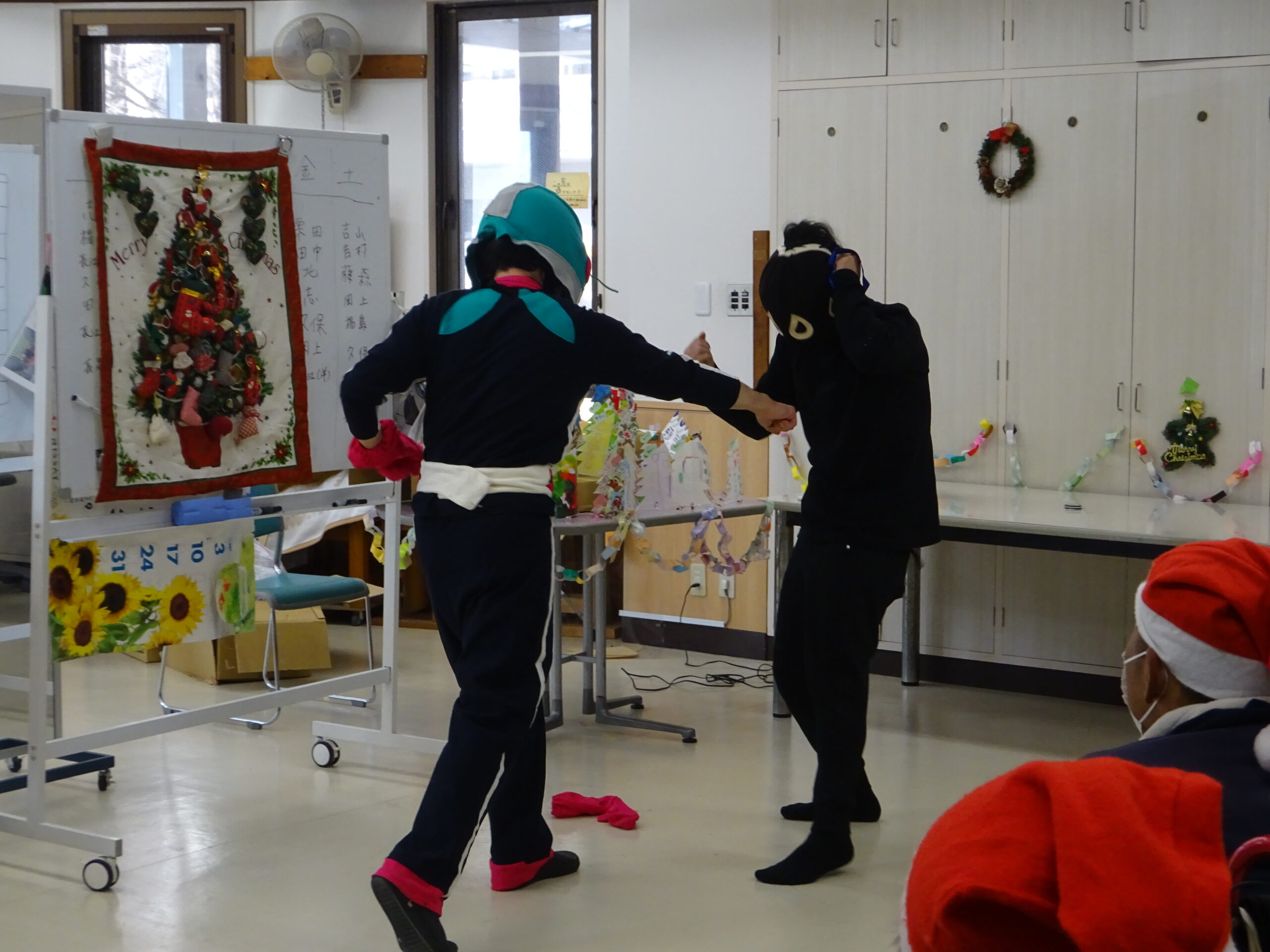 入社のきっかけでもお伝えしましたが、本当に日々笑いが絶えません。私たちもいっぱい笑かされるし、利用者を笑かすのも楽しいです。関西だからなのか、支援中にボケとツッコミがいます。職員利用者問わず。それがとにかく楽しいんです。写真のような催しもあります。私が黒い怪人の方です(笑)